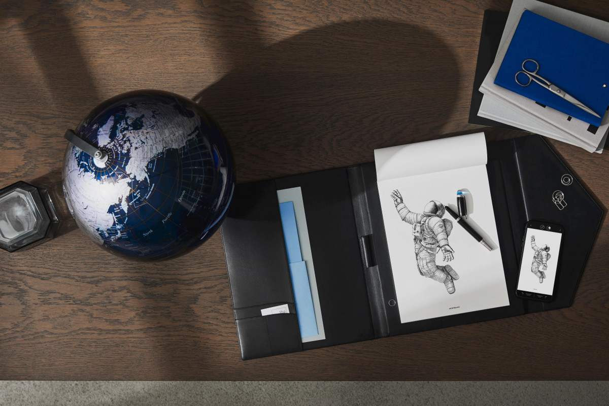 ▲義大利全粒面小牛皮材質之封套內含電子數位轉換器、A4尺寸記事本以及全新星際行者系列原子筆,書寫工具的萬寶龍標誌下方採半透明藍色圓拱設計,令人聯想到從月球地平線升起的太陽。參考價:NT$ 35,400