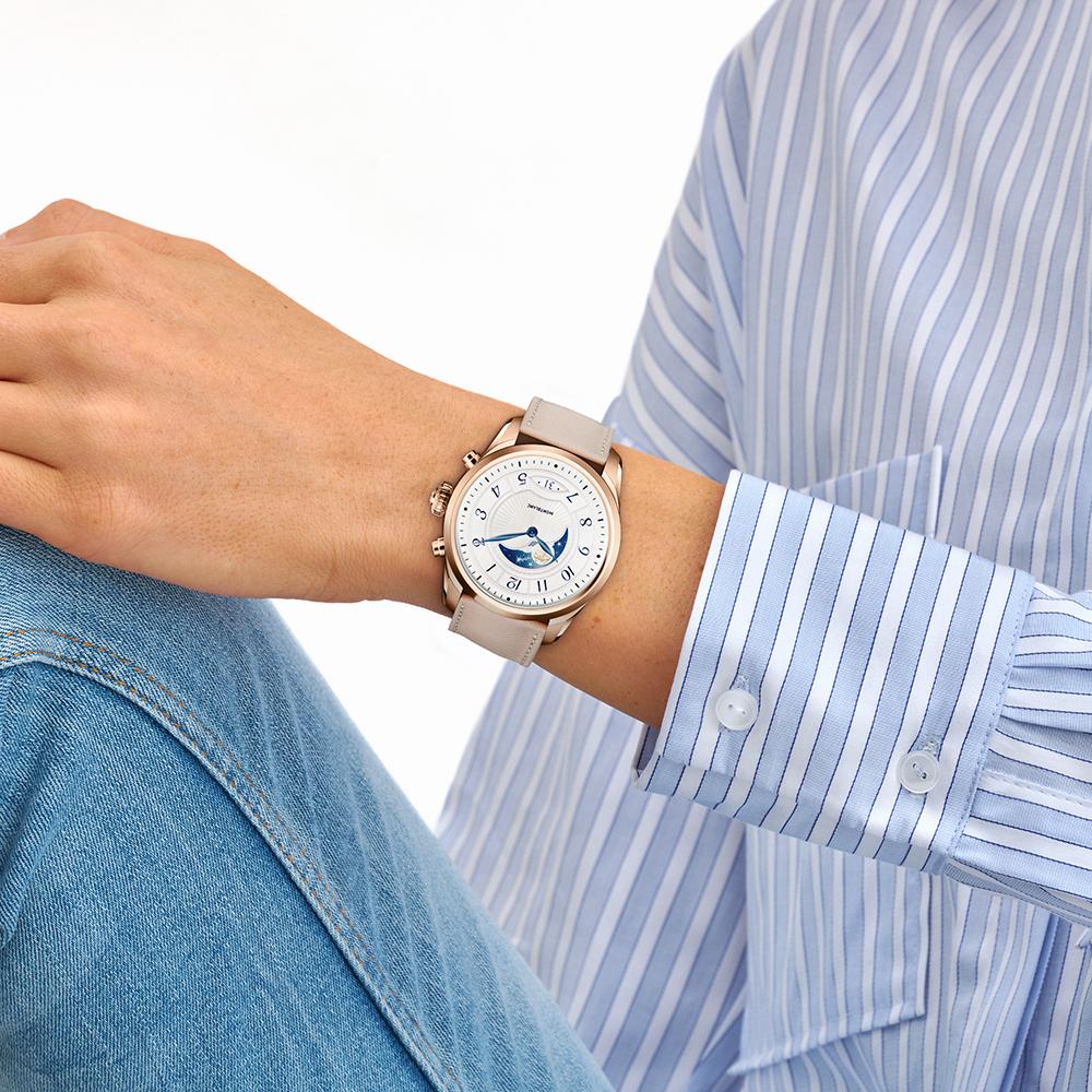而萬寶龍同樣以數位方式詮釋高級錶,Summit 2系列智能錶將瑞士傳統腕錶設計密碼、頂級材質與創新穿戴科技完美地融合在一起,打造成一款能夠陪伴佩戴者在生活各方面保持領先地位的智能錶。全新推出的錶款採用42mm玫瑰金色不鏽鋼材質精巧錶殼,搭配奶油色的萬寶龍Sartorial皮革錶帶,以及數款蘊含精緻美學的萬寶龍錶面,散發優雅典範。