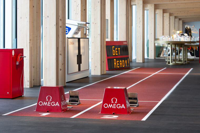 在歐米茄的全新博物館,透過配備正統官方指定計時技術的儀器,參觀者能在9米跑道上實現成為奧運選手的渴望。其中使用的計時技術包括著名的起跑器以及紅色電子起跑槍。在這道跑道上奔跑時,甚至可以獲得由歐米茄光感應終點攝影機(Scan ‘o’ vision MYRIA)捕捉的一張終點線照片,這款攝影機每秒可拍攝高達10,000張電子影像。