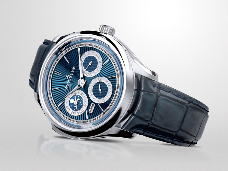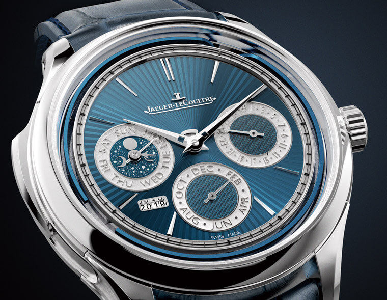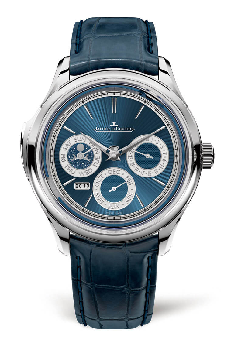 ▲正面的萬年曆是積家常用的模組,具備四位數的年份顯示、指針式的月相以及面盤中央的禁止調校警示。盤面採用2019年品牌主打的機刻放射紋加上透明藍琺瑯,另有白面款式改成細目的梨地紋。