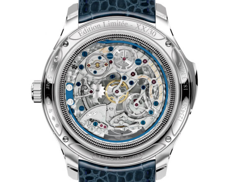 18K白金材質/950自動上鍊機芯/時、分、日期、月份、星期、年份顯示/三問功能/萬年曆功能/月相顯示/藍寶石水晶鏡面、透明底蓋/防水50米/錶徑43mm/限量30只/參考價:NT$ 8,750,000