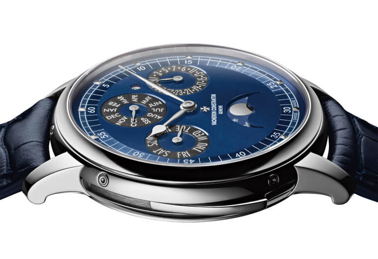 值得一提的是這款的日期和星期並沒有剛剛好落在中心的水平軸線上,而是高了約12度左右,為錶面的左下和右下兩塊位置騰出較多空間,有鑒於同一套模組也常常使用在其他大複雜功能上頭,如此安排或許是為了在這兩個位置塞入更多功能顯示(比如說日出日落時間)。錶款的外觀就是一派江詩丹頓式的經典面貌,儘管搭載了兩種高階複雜功能——其中包括了需要共鳴空間的問錶,連殼的厚度仍然只有10.44mm;1992年推出的三問萬年曆30020採用了更花俏的淚滴式錶耳,比起來這款的造型就保守得多,要是這裡也能換上Fancy Lug的話對老錶迷來說搞不好又是另一種魅力。