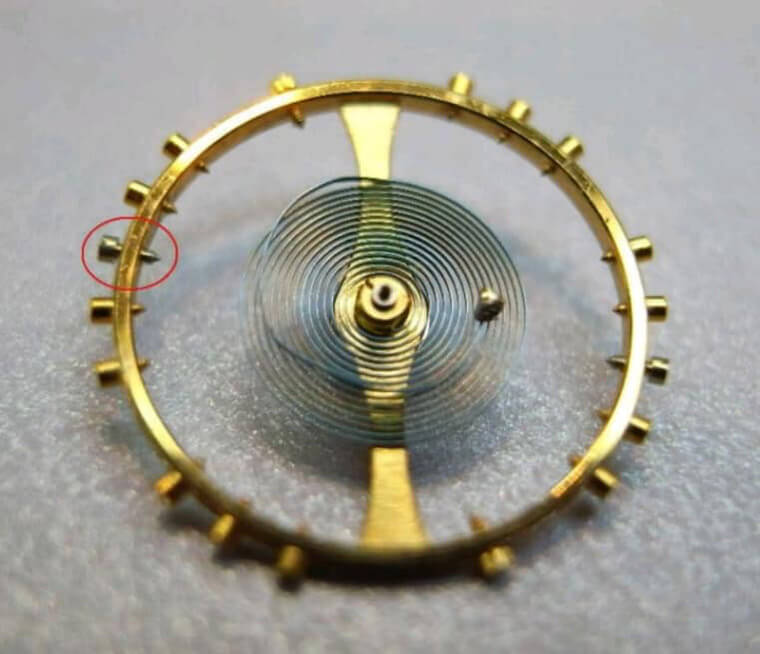 ▲螺絲平衡擺輪有4顆螺絲可微調快慢(紅線圈起),另有2顆一字型螺絲可調校方向差。傳統的藍鋼雙層游絲也是1570的特色,目前則採用合金雙層游絲。