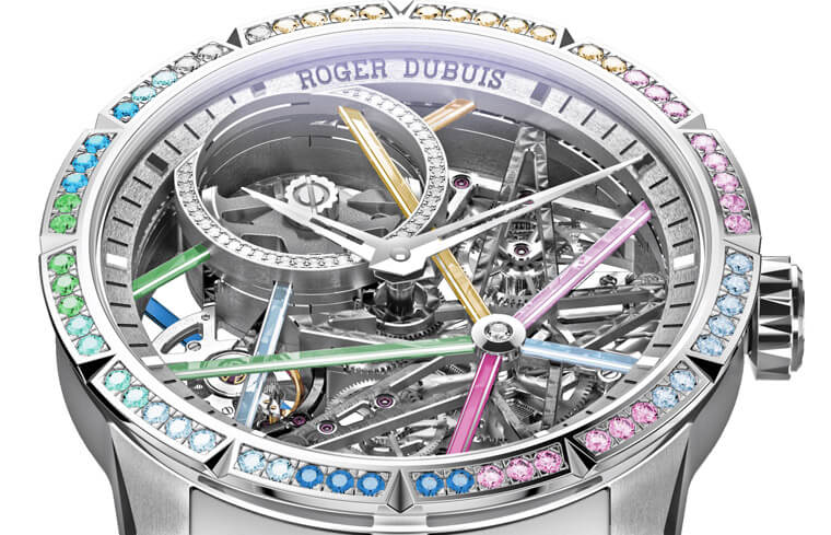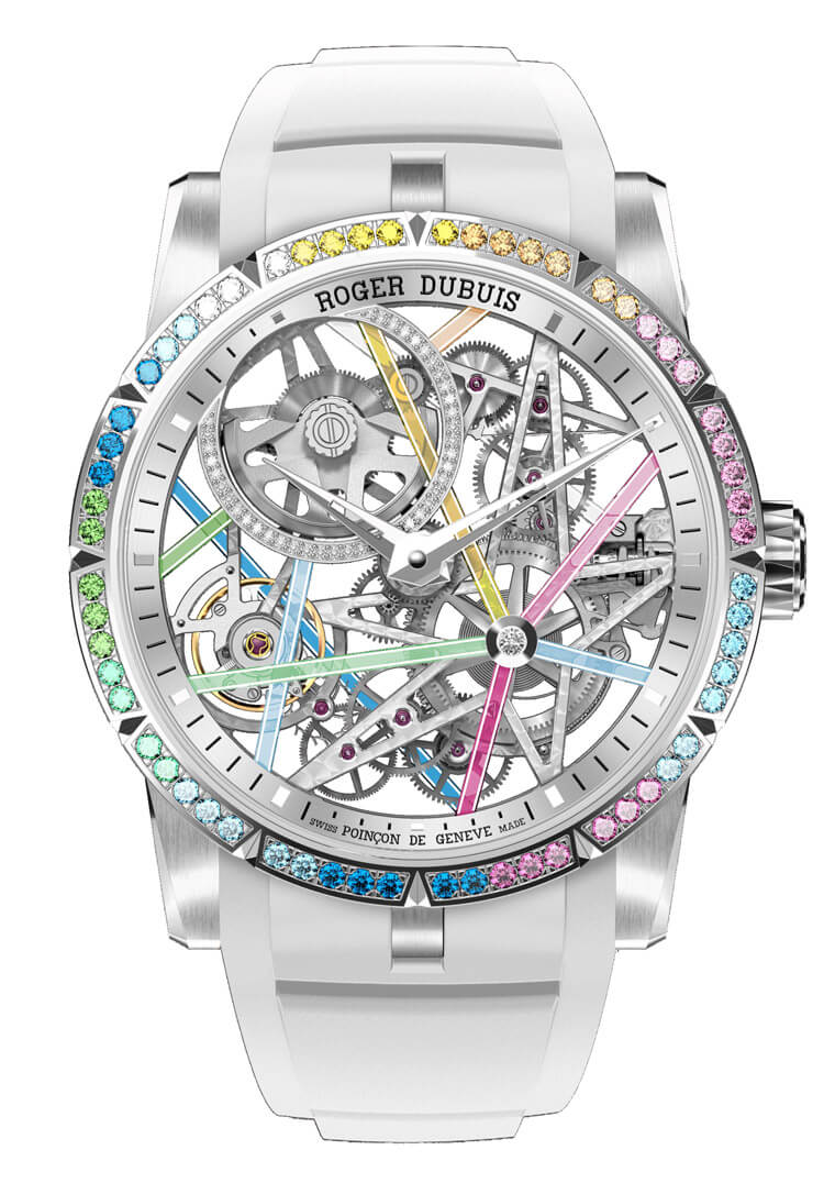 Excalibur Blacklight限量版以白金材質製作錶殼,錶圈上的多色寶石包括藍寶石、電氣石與石榴石,總計達60顆,約重1.1克拉,它的錶徑42mm對於亞洲人而言不會顯得負擔沉重。羅杰杜彼替錶款配置的是白色橡膠錶帶,這與錶款散發的優雅貴氣剛好可以呼應,有別於Excalibur系列與人的粗獷形象,反倒呈現出一絲斯文的氣質。