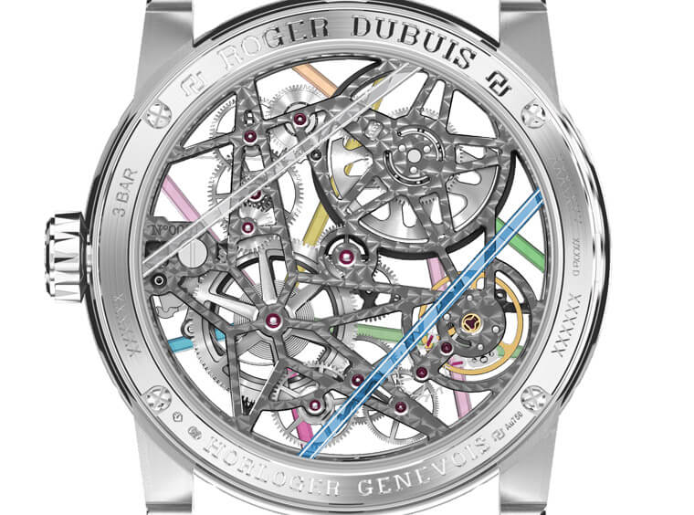 Excalibur Blacklight強調它是羅杰杜彼首次將人工培育的藍寶石技術應用於製錶,手錶機芯本身的鏤空結構設計得相當精巧細緻,而品牌還特地在錶圈鑲上不同顏色的藍寶石,至於機芯橋板上鑲嵌的藍寶石,它的特色是當在暗處經由紫外線照射下發光時,能讓機芯結構的立體感變得更明顯,會讓人有一種機芯像飄浮在錶殼內的錯覺。將我們對RD820SQ機芯的印象推展到不一樣的層次。