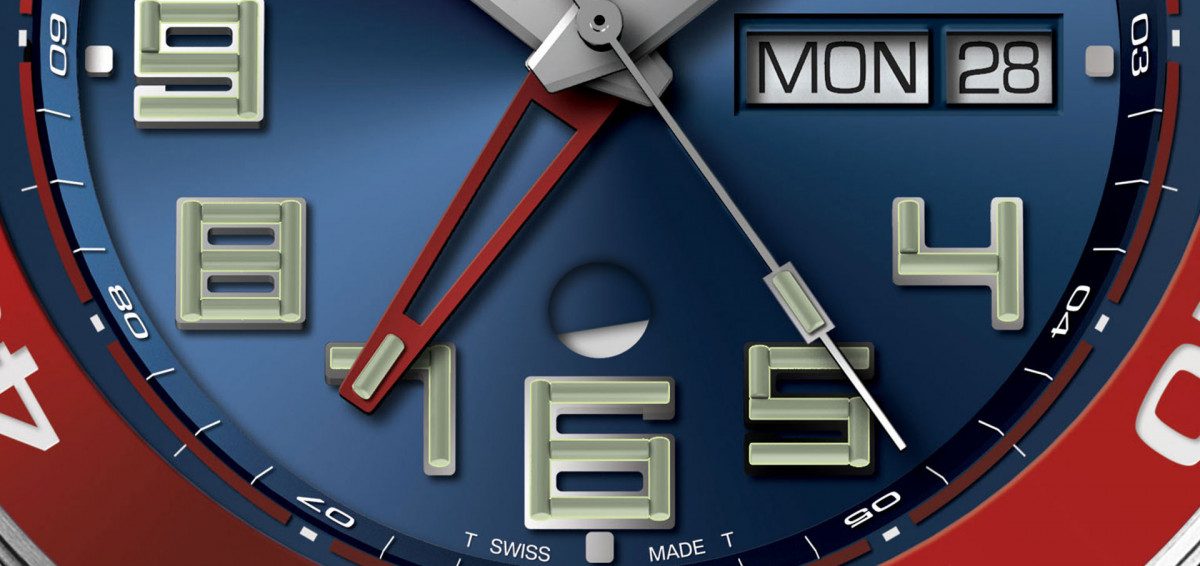 ▲面盤6時位置為原居地時間的晝夜顯示窗,白色為晝,藍色為夜;再加上星期及日期的顯示。