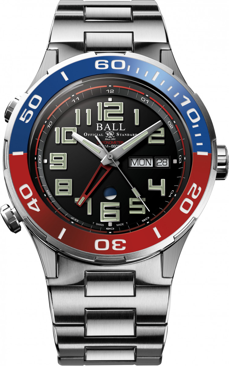 不鏽鋼材質/BALL RR1303-C自動上鍊機芯/時、分、秒、日期、星期顯示/兩地時間顯示/日夜顯示/藍寶石水晶鏡面、透明底蓋/防水300米/錶徑40mm/參考價:NT$ 66,410/另有藍面盤款式