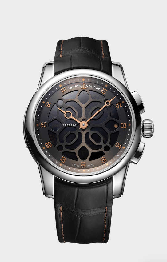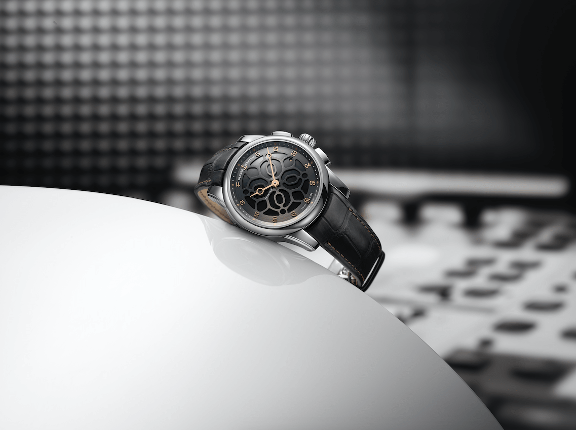此款手錶搭載鍛光裝飾的煤灰色面盤,靈感源自克拉德尼聲紋圖形。面盤將聲波震動形象化,以致敬帝瓦雷Phantom音響高頻單元上的護網。在此塊鏤雕蕾絲狀的網面之下,有色玻璃覆蓋於機芯之上,賦予手錶超現代的外觀。另一個細節上的原創設計是阿拉伯數字時標環繞著玫瑰金色的指針,像海軍指南針一樣,時標向外傾斜,並呈單列順時針方向排。