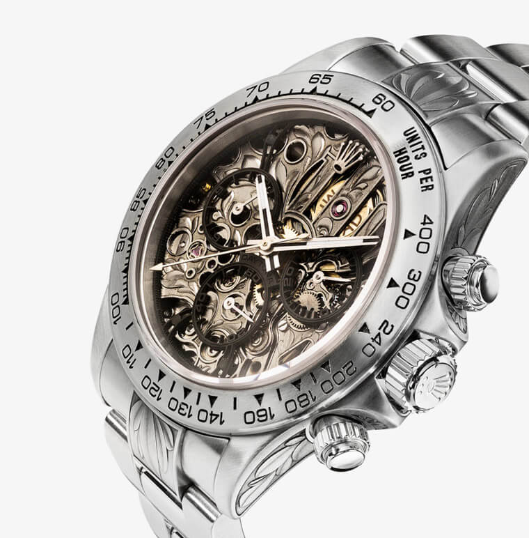 知名的法國改裝錶品牌MAD Paris近期又有新作,他們改良了勞力士Daytona 116520,將原本的素面計時碼錶改成開面雕花版的Daytona Openwork SK II!使得這款經典計時碼錶瞬間變得華麗中帶點小浮誇,而由於是手工改造,因此錶款雖然是不鏽鋼材質,但是它的售價也跟著飆漲到猶如貴金屬鑲鑽等級,特殊的造型引起喜歡佩戴跟別人不同手錶的藏家關注。