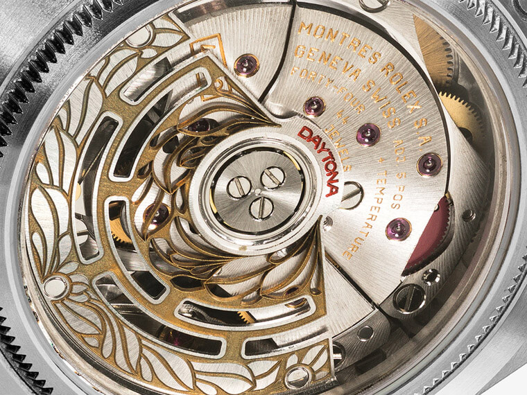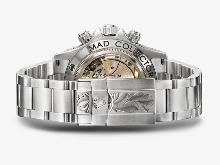 既然是改裝錶,那麼錶背換成透明底蓋也是很合理的事,MAD Paris在底蓋周圍刻上了自己的品牌字樣,並讓「改款」後的4130機芯大方呈現在佩戴者眼前,機芯背面最主要的修改還是在自動盤上,為了呼應面盤和錶殼的雕花,MAD Paris一併將自動盤局部鏤空並且加上一些雕刻花紋,滿足機芯控想要欣賞機芯(而且還變得更有看頭)的願望。改成透背後的Daytona Openwork SK II多少影響了它的防水性能,從市售版的100米降為50米,因此如果要佩戴這款錶去從事水上運動要多注意一下了。