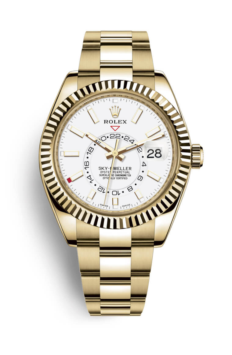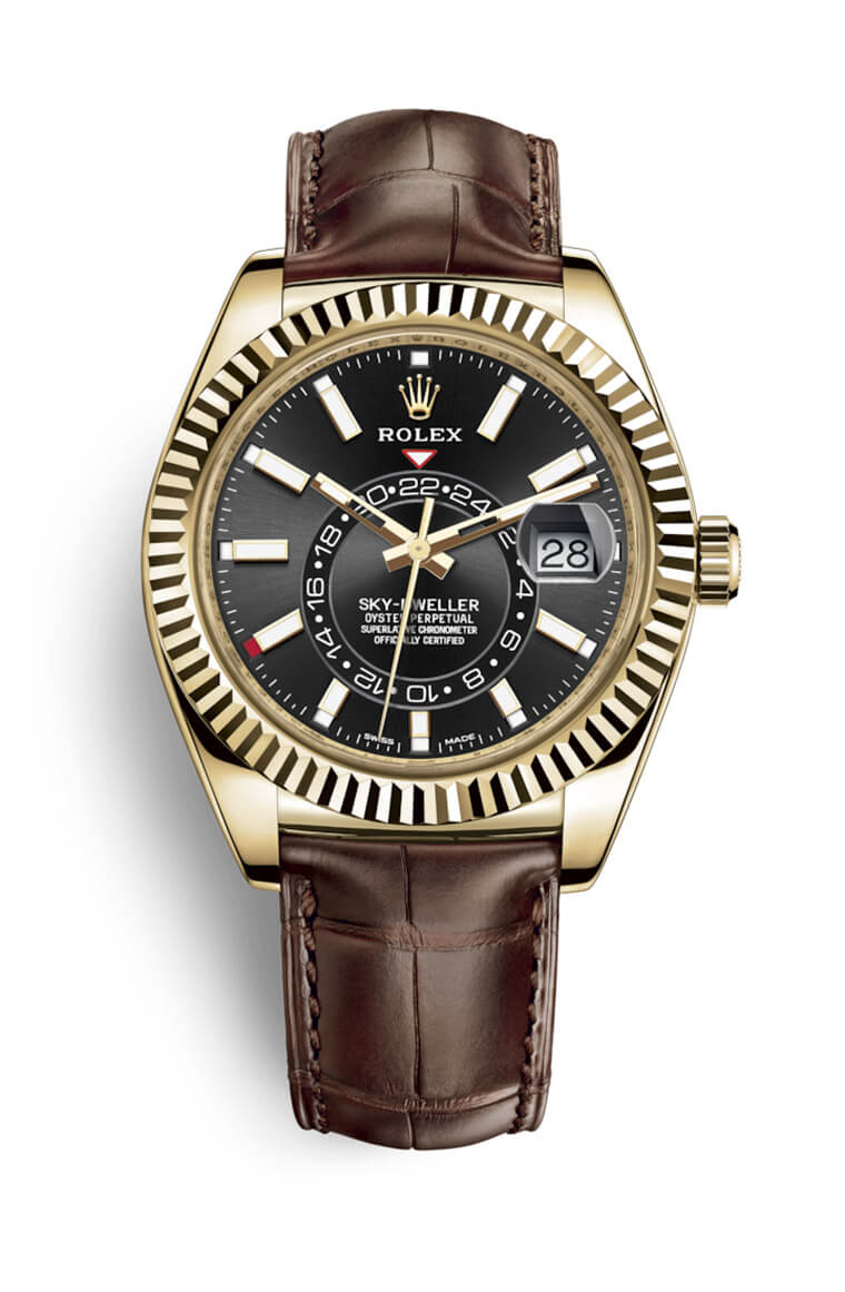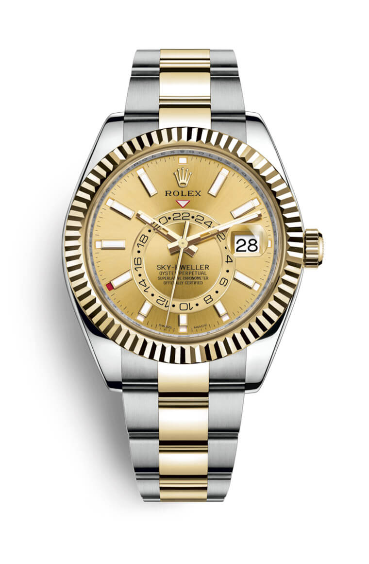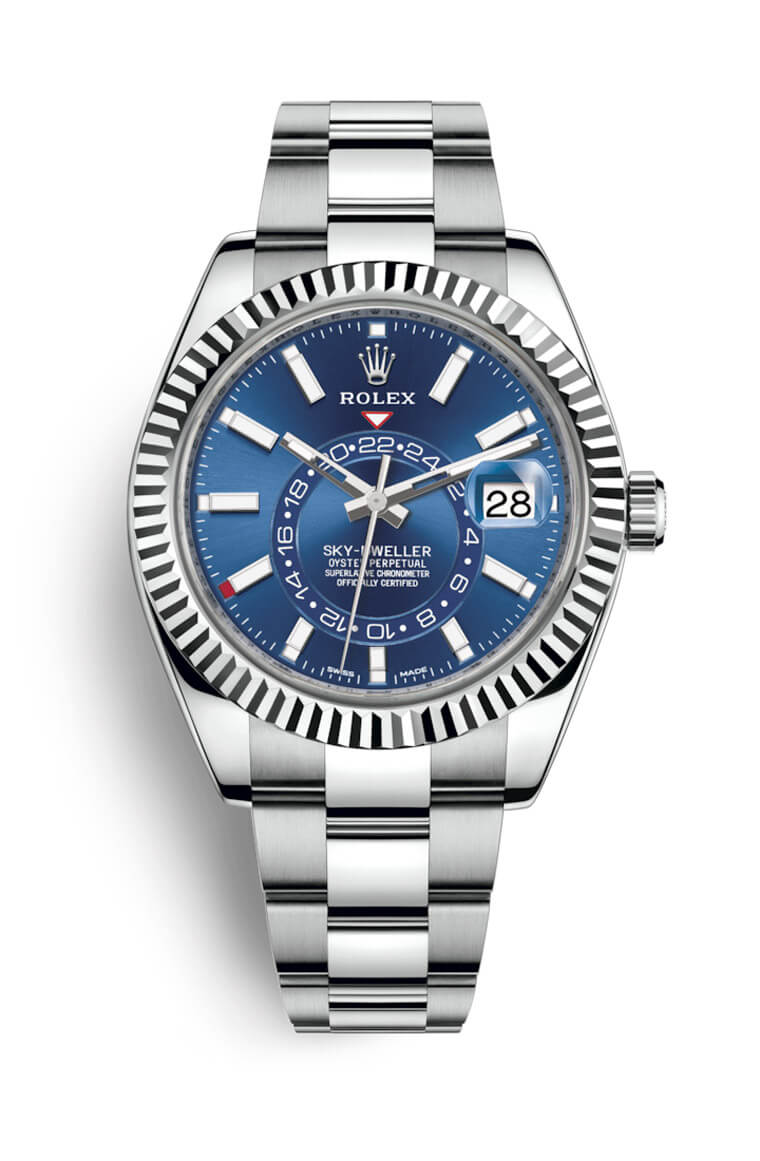 勞力士旗下的Oyster Perpetual運動錶系列以耐操實用聞名,所以品牌多數系列的基本款都有不鏽鋼這個選項,一來價格相對親切,二來講到實戴型的錶,不鏽鋼錶殼往往會讓人有一種安心感(即使表面產生些小瑕疵也比較不會心疼),不過凡事總有例外,在Oyster Perpetual家族旗下還是有些系列就是沒有推出純粹不鏽鋼錶殼的作品,包括Day-Date、Pearlmaster和遊艇一代等等,其中功能最複雜的要屬Sky-Dweller的年曆+兩地時間功能。
