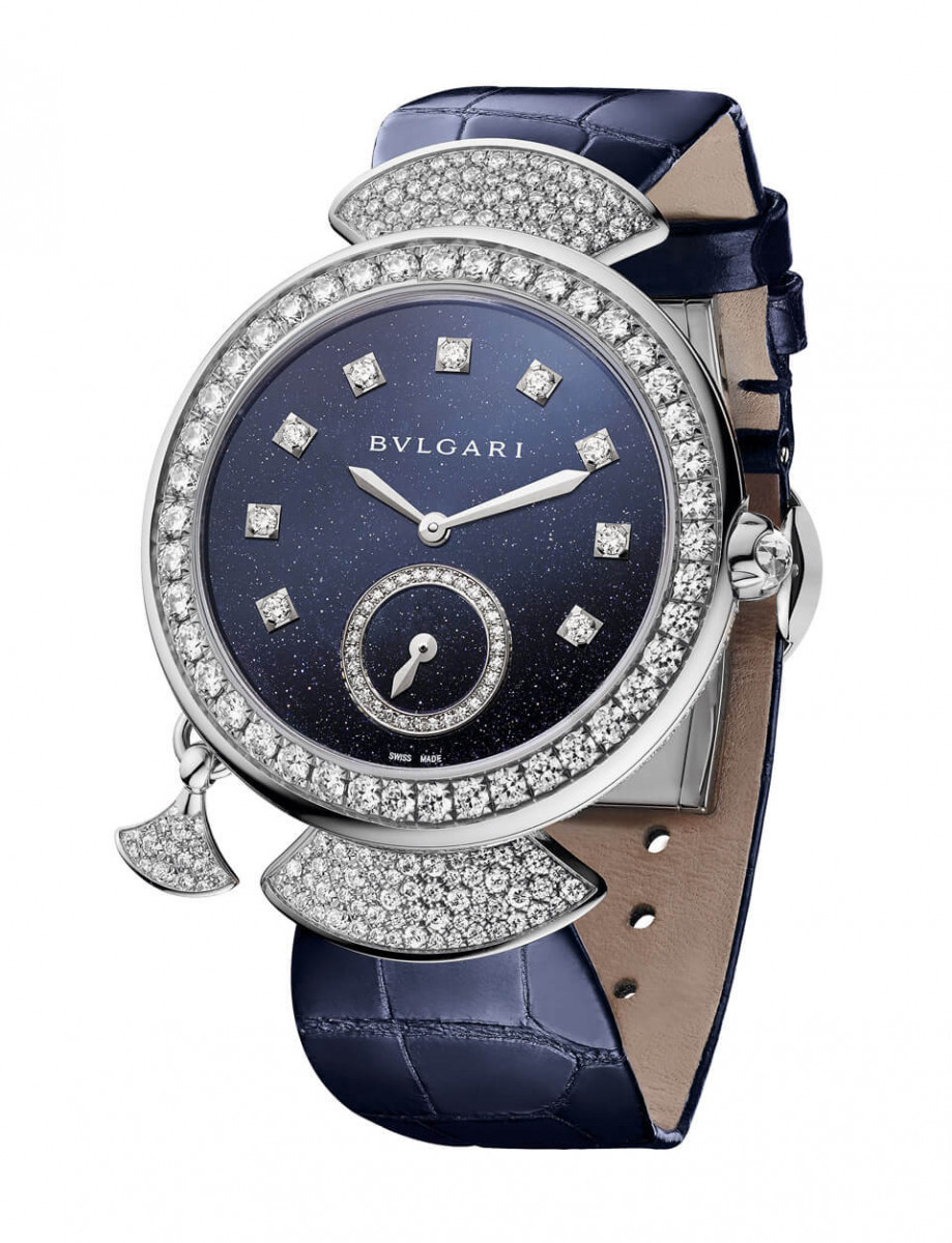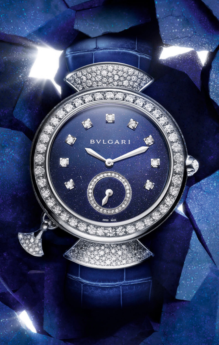 另一款同樣卓爾不凡的Divas' Dream Finissima Minute Repeater 三問錶,結合寶格麗宗師級的珠寶與製錶工藝,將義式浪漫融入瑞士嚴謹的製錶工序。這是寶格麗全新的傳奇傑作,為珠寶與腕錶帶來又一次巔峰詮釋。不僅如此,Divas' Dream 也是目前市面上唯一搭載超薄的三問機芯的女錶,這只腕錶的機芯源自2018年寶格麗推出的世界最薄三問錶─Octo Finissimo三問錶的BVL 362機芯。在女力崛起的世代中,寶格麗以高級複雜功能搭配奢華珠寶慶賀女力精神。Divas' Dream三問錶的深藍色砂金石面盤以鑽石鑲嵌環繞,幽藍色彩搭配其上點綴的點點光澤如同絕美星空,搭配經典扇形綴飾作為三問報時的啟動推桿,加上璀璨亮眼的密鑲鑽石設計點綴,讓整只腕錶的視覺效果更加富足美麗。