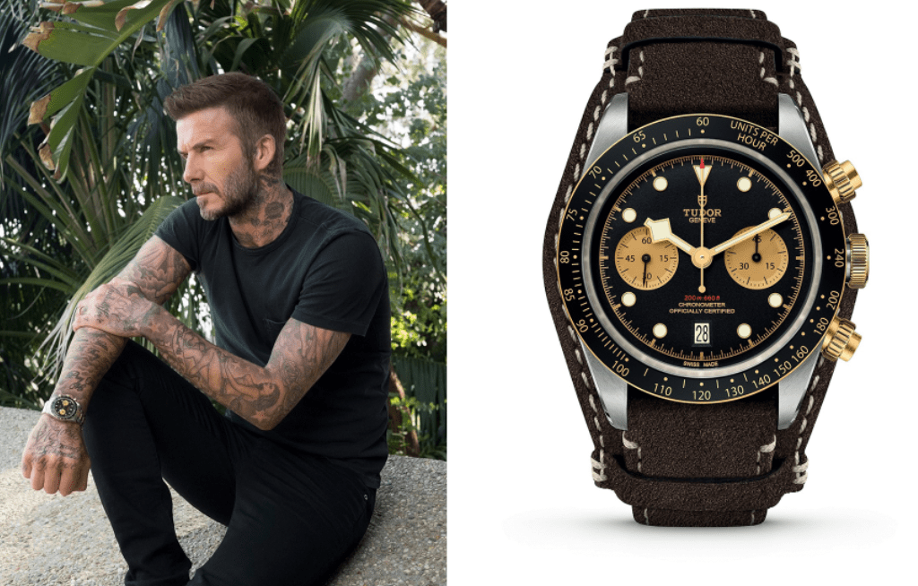 ▲貝克漢所佩戴的Black Bay Chrono S&G融合了系列代表的潛水錶傳統與賽車界不可或缺的計時錶精髓。