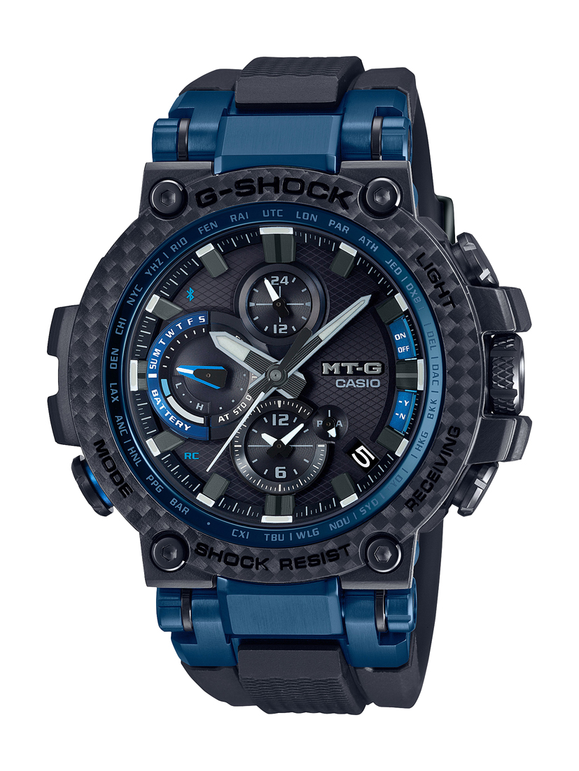 全新MTG-B1000XB系列採用碳纖維製成錶圈,碳纖維被認為繼金屬和樹脂物料後的「第三種材料」,作為MT-G系列邁入20週年的材料進化紀念里程。在重量方面,碳纖維與樹脂相近,同為輕量物料;而耐用性方面,雖然碳纖維的硬度使其較難加工,但其耐用程度與金屬相仿或超越金屬。然而,卡西歐更進一步突破多層立體成型和切割技術,使碳纖維能夠用於複雜的錶框零件上。從側面欣賞錶圈時,彩色層與黑色碳纖維層形成對比,而獨特的碳纖維編織賦予錶圈及錶面獨特的外觀與不凡的吸引力。