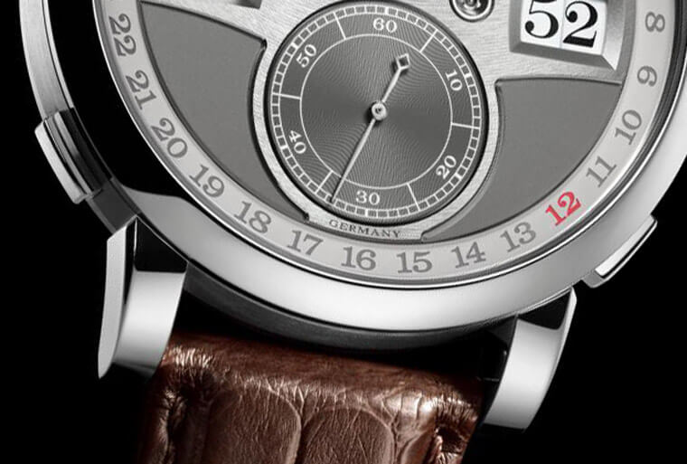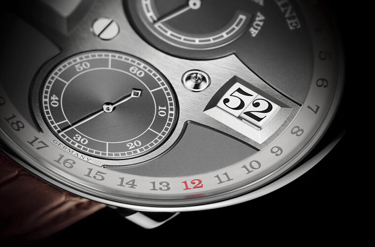 ZEITWERK系列打從2009年問世以來就保持目前我們所熟悉的樣貌——於素雅的面盤上透過名為「時間橋」的組件,以不同材質、色調以及打磨方式將小時、分鐘,加上6點方向小秒盤等基本時間資訊與面盤整體區隔出來,ZEITWERK DATE依舊維持了這項傳統,因此可見它的灰色實心銀面盤與鍍銠德國銀時間橋呈現出一深一淺的色調對比感;此外於面盤的12點方向則是配合錶款搭載手動上鍊機芯的需求而專程設置了動力儲存顯示,從顯示刻度兩端的”AUF”和”AB”字樣可知其源自德國製錶的血統,ZEITWERK DATE具有72小時、亦即3日鍊動能,因此動力儲存顯示每一格代表了6小時,當動力消退到剩下最後12小時,此時顯示刻度也從白色轉為紅色,提醒佩戴者要注意重新替腕錶上鍊補充動能。