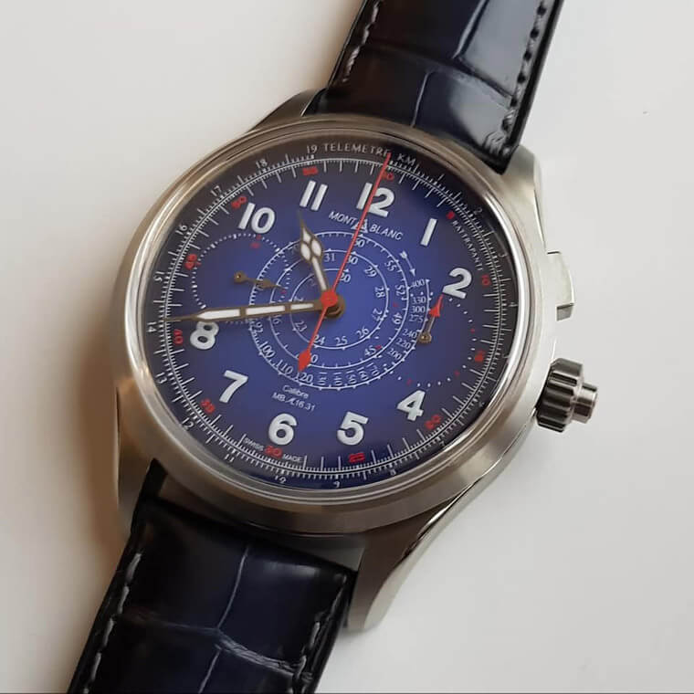 ▲單按把同軸追針功能,測速可達3分鐘(最慢20公里,一般為60公里)。據資料顯示是藍色瑪瑙材質面盤,很特別。