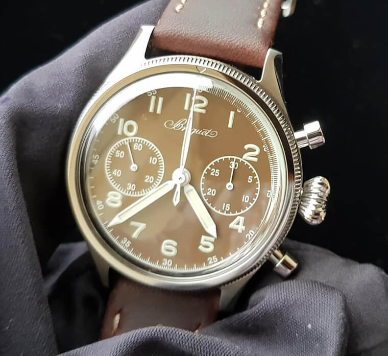 這三只錶分別是萬寶龍的1858 Split Second Chronograph,它有Minerva錶廠加持,朝頂級製錶邁進,錶背看到複雜的追針結構,讓人看得賞心悅目,這款錶預估拍賣價格在4萬2千瑞郎~4萬8千瑞郎之間。另外寶璣提供的Type 20是復刻1950年代的航空飛行軍錶,Roger表示這款復刻與原版的相似度接近99%,主要的一點點不同是面盤從黑色改為棕色呈現一種天然的歲月感,讓人感覺有點像變了色的熱帶面盤,美極了,預估價為3萬5千瑞郎~5萬瑞郎。