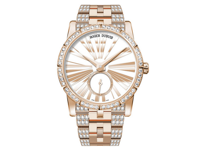 此款手錶體現了羅杰杜彼代表性的前衛精神,並從中萃取出精美絕倫的珠寶特質。手錶錶鏈鑲嵌708 顆美鑽,總重4.25 克拉, 彰顯極致奢華魅力與華美之韻。寶石環繞拋光錶鏈中央, 形成兩道對稱的璀璨光流。錶圈鑲嵌48 克鑽石, 總重0.99 克拉。手錶錶殼、精緻的羅馬數字立體鑲貼時標以及環繞6 時位置小秒盤的圓環均以玫瑰金材質打造, 與令人目眩神迷的鑽石之舞交相輝映。