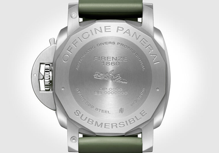 ▲錶殼上刻有慢速魚雷的圖案,彰顯了沛納海曾經身為義大利海軍儀器供應商的歷史淵源。