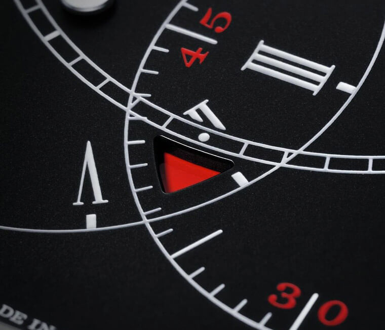 ▲有別於一般常見的動力儲存顯示,RICHARD LANGE跳秒錶改用白色和紅色色塊抽象傳達腕錶動力的「充足」與「即將耗盡」兩種狀態,佩戴者一看顏色就能瞭解是否需要替腕錶上鍊。
