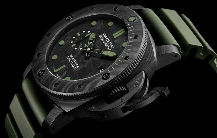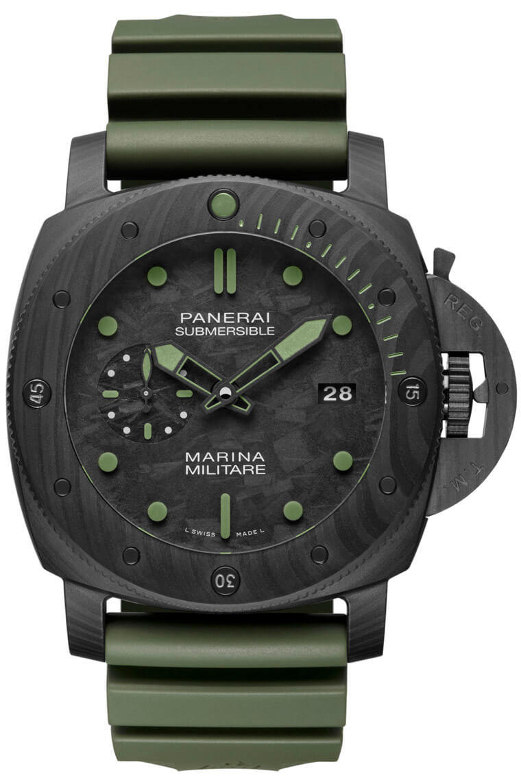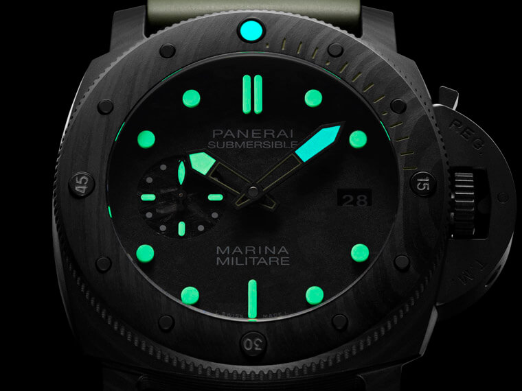 Submersible Marina Militare Carbotech™限量錶無論在腕錶的設計風格及品質等層面都以符合軍隊的需求為前提,錶殼直徑達到47毫米,採用沛納海獨家的Carbotech™碳纖維複合物料製成,這種物料是以碳纖維為基礎成分,塑造出比鈦金屬更輕巧、比不鏽鋼更堅固的質感,Carbotech™的結構特色在於利用特殊聚合物,將極纖薄的碳纖維層融合,如此一來每款錶皆會呈現獨一無二、狀似迷彩的紋理,錶殼與碳製面盤設計相輔相成,後者於3點鐘位置設日期顯示,並於9點鐘位置設小秒盤。限量款與一般版(PAM00979)最明顯的差別在於它採用軍綠色來點綴細節,包括Super-LumiNova®夜光塗層以及橡膠錶帶等等,就連錶圈潛水刻度也一樣塗有軍綠色夜光塗層,在黑色錶殼與面盤的襯托下,將軍事風格主題詮釋得淋漓盡致。