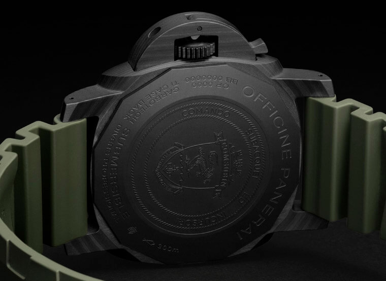 這款PAM00961與一般版同樣採用鍍黑的鈦金屬實底蓋,有別於後者是刻上義大利海軍突擊隊員的示意圖像,並刻上「Survival Instrument(求生裝備)」這樣的註解,限量版則是在底蓋上刻上前述義大利海軍特種部隊"Comsubin"的隊徽——在盾牌中內有一隻眼鏡凱門鱷與船錨,體現該部隊「潛藏大海,突襲敵軍」的隊訓。