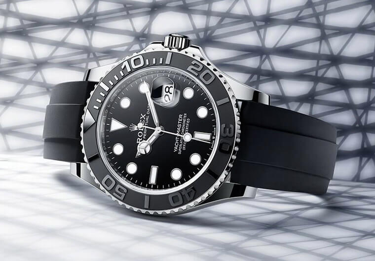 全新出擊的Yacht-Master 42擁有遊艇一代中最大型的尺寸,錶殼採用高貴的18ct白色黃金打造,值得一提的是,這是此系列無論一代或二代首度啟用18ct白色黃金材質的「首航」,同時它與部分的37mm、40mm Yacht-Master腕錶同樣配置了啞黑色Cerachrom陶瓷錶圈,此一雙向旋轉錶圈設計的用意不僅是能輔助閱讀分鐘資訊,實際上它還帶有提醒船員在颮線來臨前的剩餘時間、記錄換帆或收帆時間,或是計算通過航標的所需時間等等,看起來不起眼但卻充滿了實用效果,而且陶瓷錶圈的防刮保護性和不會褪色的特性等都讓它受到市場青睞,也是Yacht-Master 42沿用這項研發成果的主因。這款也如同系列部分款式採用勞力士專利的Oysterflex橡膠錶帶,對於常進行戶外活動的人士而言,橡膠錶帶具備的柔軟、舒適性是他們特別讚賞的優點。