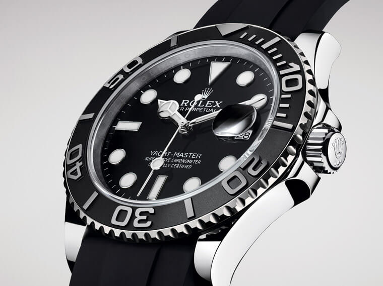 ▲Yacht-Master過往以18ct永恒玫瑰金、鉑金鋼或永恒玫瑰金鋼為主要材質,2019年新款首開系列先例採用18ct白色黃金材質,搭配啞黑色陶瓷錶圈,勾勒出腕錶堅實高雅的氣質。
