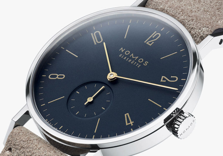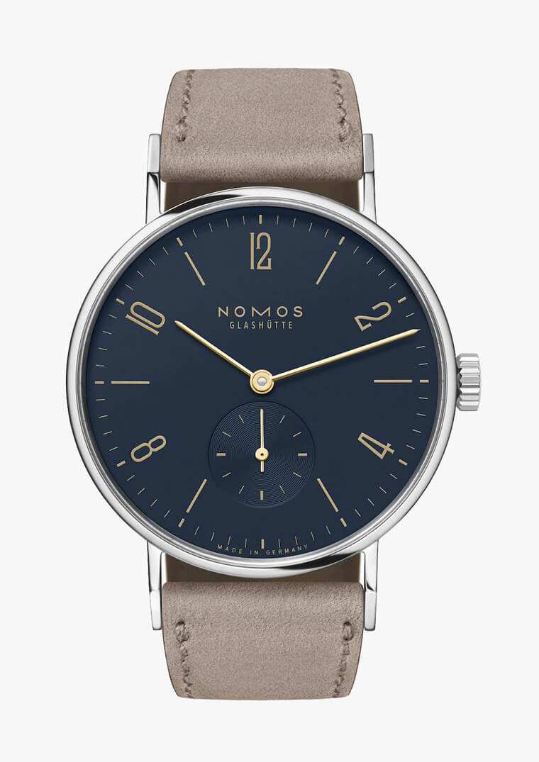 而錶徑35mm的Tangente午夜藍手錶則是配置了米色絨面皮革錶帶,以尺寸而言,這款除了男性以外,女性佩戴也很剛好,而淺色錶帶則能帶給女性朝氣感,而且還能以對比效果來突顯深藍色面盤的視覺魅力。Tangente午夜藍手錶不只是錶徑比前面介紹的那款略小,NOMOS也特別在它的面盤上點綴金色指針、時標與刻度,手錶因此而產生出一種微奢華的氣勢,對女性而言,有亮麗的金色加持肯定能提高她們對這款錶的興趣,細看就連面盤六點方向”MADE IN GERMANY”字樣也一併改成金色的,展現NOMOS對於細節的嚴謹要求。