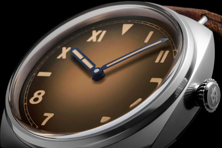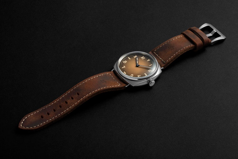 這款錶雖然外觀大部分都與原型錶款相近,但是它的面盤卻和原型的黑面有點出入,Roger表示PAM000931的面盤具有從中心往外緣由金黃色漸變為咖啡色的層次效果,有點像早期的黑面放到現在後自然的褪色質感,不過整只錶又是如假包換的全新款,光這點就讓喜歡復古風格的玩家愛不釋手了。而錶款採用的加州面盤上半部為羅馬數字時標、下半部則是阿拉伯數字時標,Roger補充說明這種設計是當時為了避免佩戴者在黑暗環境中看錯時間所想到的點子,演變至今加州面的實用性沒這麼強了,反倒是讓手錶看起來比較特別,另外手錶還用上軌道式刻度和滾藍邊指針,這些也都很有早期手錶的味道。