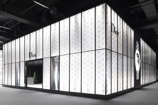 覆蓋在黑色和銀色的面紗的外牆門面,表現DIOR女性所散發出的柔和光芒。在拋光鏡體牆面強調出反射透視的效果。氣派的樓梯引領你進入邁入DIOR花園的入口,在2樓的上層空間,以開放式的屋頂,透過古銅色照明光線喚起了絢麗多姿的凡爾賽,而地板上的地毯圖騰設計將法式花園與灌木小徑描繪於其上。