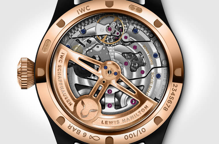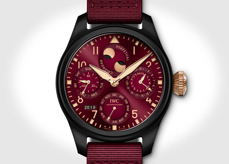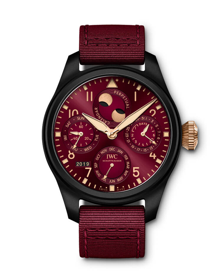漢米爾頓和IWC決定採用黑色陶瓷來製作錶殼,另外錶冠和底蓋邊緣部分則是以紅金點綴出尊貴感,錶殼46.5mm的尺寸對於漢米爾頓這種體格健壯的運動員而言戴起來恰到好處,目前市售版的Big Pilot’s Watch Perpetual Calendar分別有綠面和藍面這些充滿色彩吸引力的款式,然而漢米爾頓這款大飛萬年曆更大膽啟用了波爾多紅色面盤,至於指針和時標則是鍍金處理,夜光物料也是採用與金色時標相近的米黃色,這讓手錶外殼顯得低調而具有科技感,但是面盤又是呈現一派奢華溫潤,搭配IWC幫錶款配置的波爾多紅色織物錶帶,展現出漢米爾頓自成一格的時尚態度。