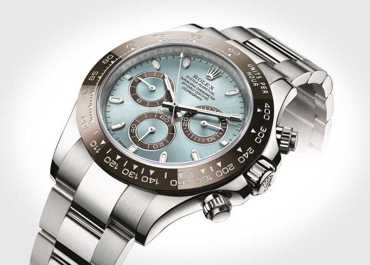 116506以貴金屬中相對罕有的鉑金材質打造錶殼,這是勞力士首度運用鉑金材質在他們家的專業系列錶款上,並擺脫常見的黑白兩色,以獨特的冰藍色調打造面盤,此外測速計的錶圈雖然依然採用品牌獨門的Cerachrom陶瓷材質,但錶圈運用沉穩中又不失動感的栗啡色也是勞力士首次在Daytona系列中做出的新嘗試,目前在系列中仍舊只有鉑金材質才會配上這種顏色的陶瓷圈,久而有之看到咖啡陶瓷圈的Daytona也讓人產生夢幻逸品的直接聯想。