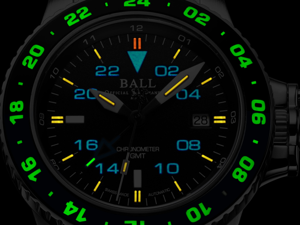 Engineer Hydrocarbon AeroGMT 系列在設計上結合了多種絢爛色彩,燦爛卻不失和諧。錶面上,黃色及橙色的微型氣燈點亮12小時刻度,而第二時區的24小時顯示則用上冰藍色「Super LumiNova」夜光塗層。在雙向旋轉錶圈則以綠色微型氣燈點照亮第三時區的24小時顯示。夜光三時區,不同顏色的配合使佩戴者可隨時隨地準確讀取三個獨立時區的時間,一目了然。