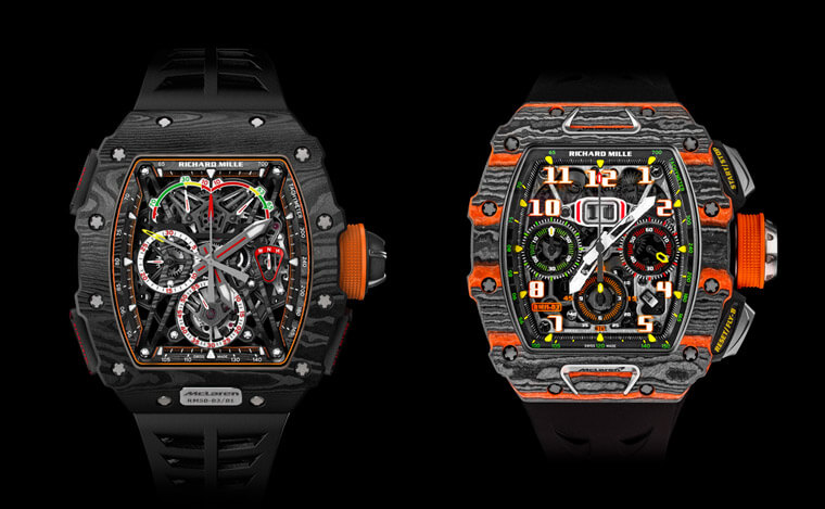 ▲左為RM 50-03 McLaren F1超輕雙秒追針陀飛輪計時碼、右為RM 11-03 McLaren自動飛返計時碼錶。