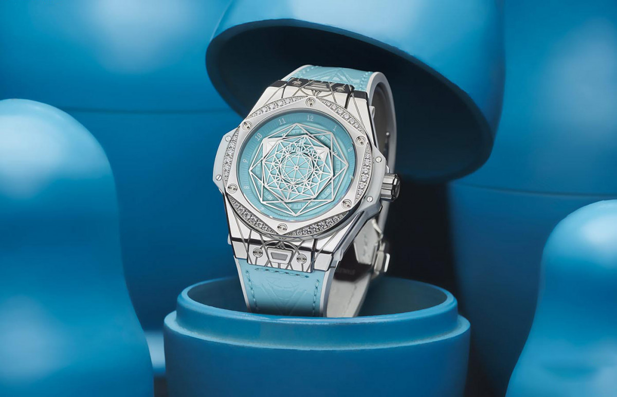 ▲Big Bang One Click Sang Bleu綠松石不鏽鋼手錶限量發行50只,以原裝禮盒呈現,禮盒內襯皮革,並裝飾Sang Bleu的特色幾何圖案。
