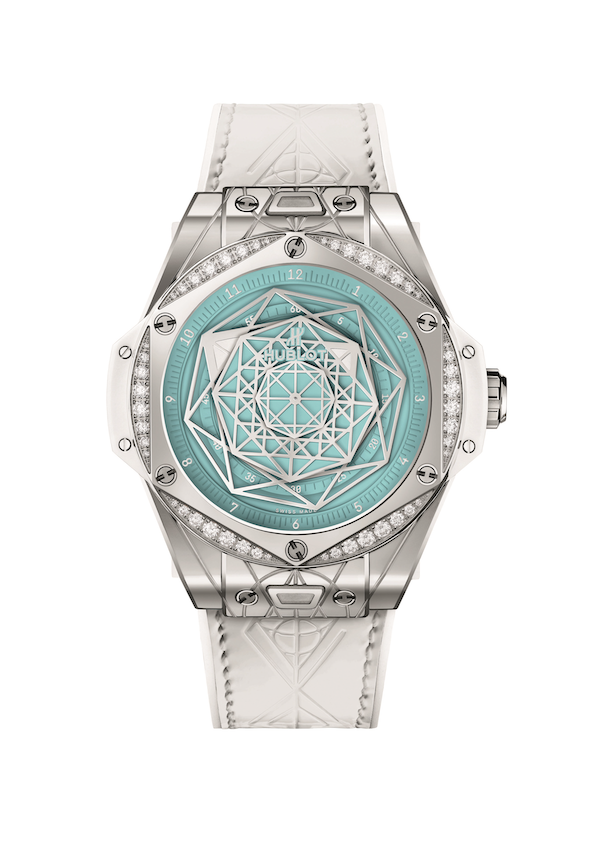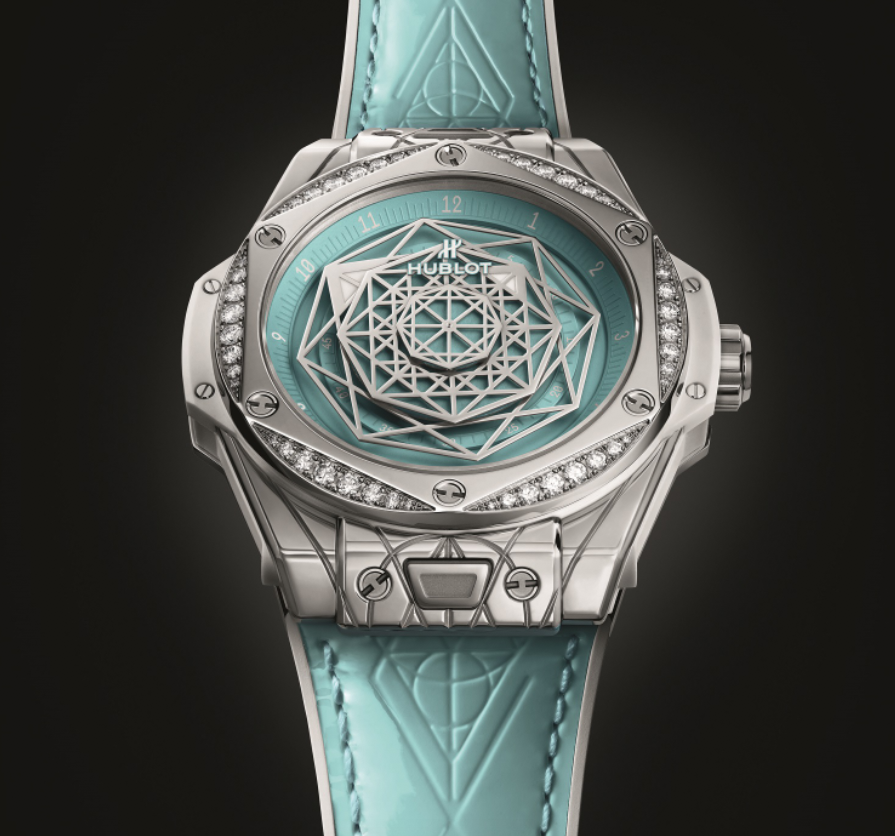 不鏽鋼材質/HUB1710自動上鍊機芯/時、分、秒顯示/錶圈鑲鑽/綠松石面盤/藍寶石水晶鏡面/錶徑39mm/限量50只/參考價:NT$ 596,000