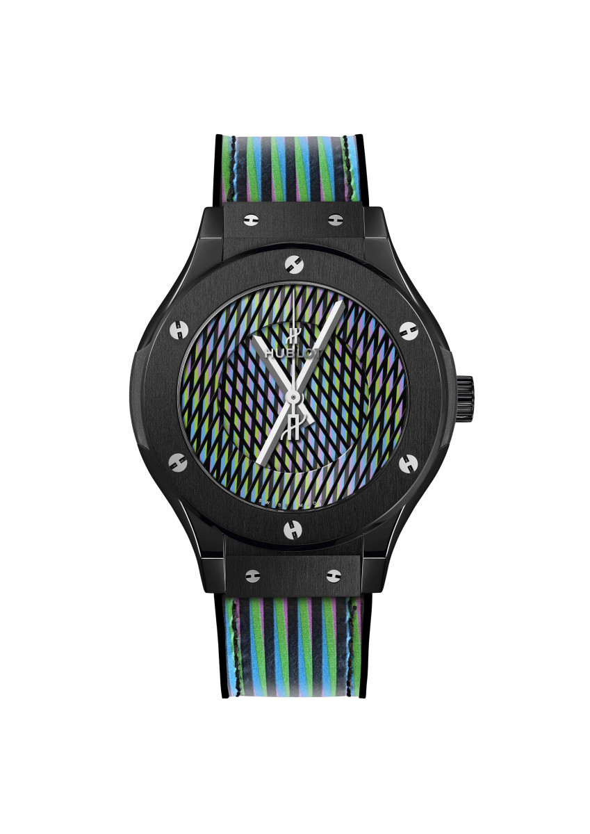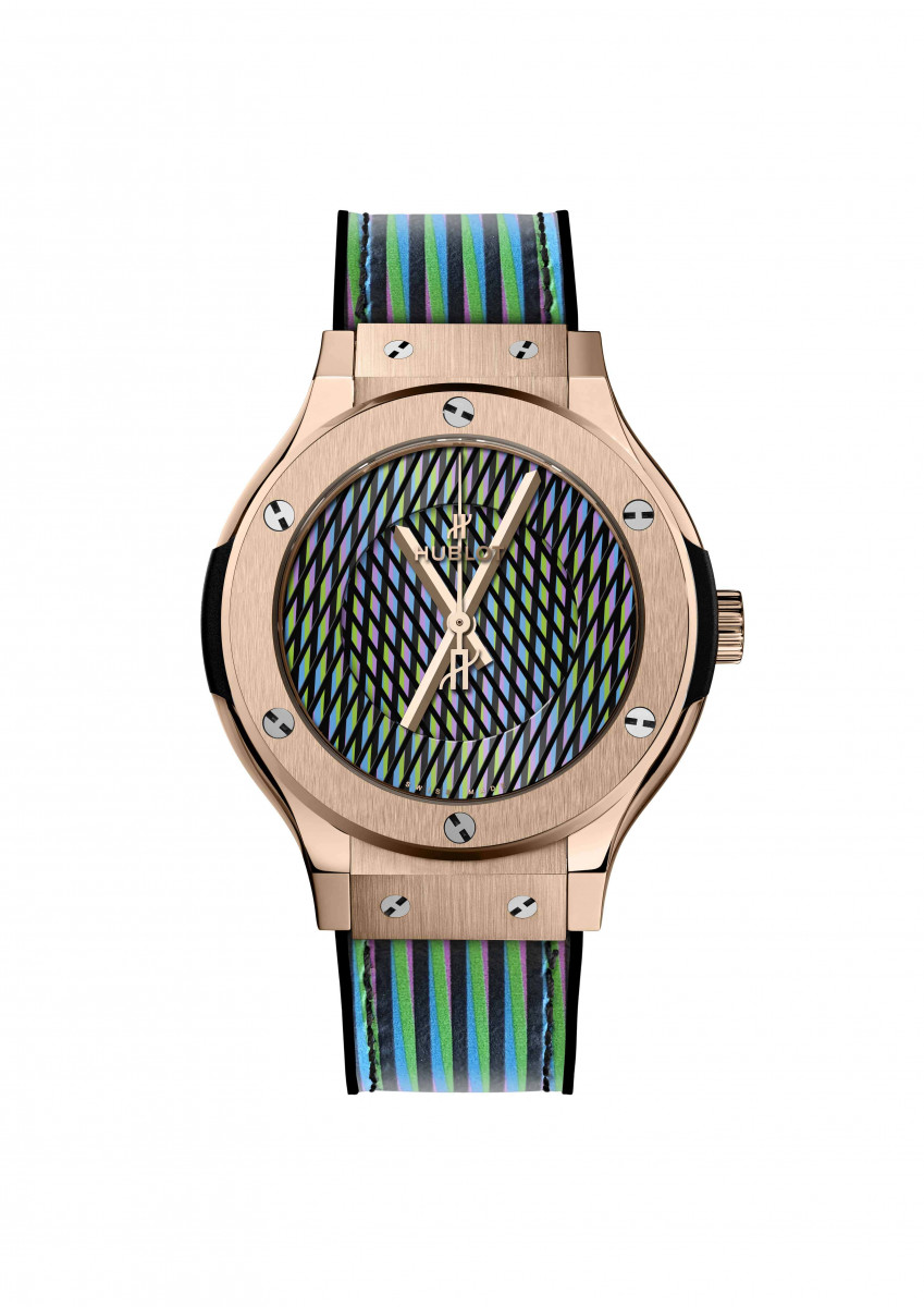 ▲經典融合系列Cruz-Diez魔幻時刻手錶系列包括直徑45毫米與38毫米兩種尺寸錶徑,皇金(King Gold),鈦金屬和拋光黑陶瓷三種材質,每款限量全球至多不超過100只。