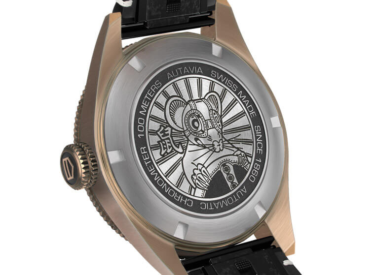 除了時標有個鼠字之外,把錶翻到背面也還藏有驚喜,原本Autavia青銅錶的背面刻的是飛機的螺旋槳圖案,但是在這款錶上則是改用童趣的老鼠頭戴傳統飛行員護目鏡、手握汽車方向盤的剪影圖案取代,老鼠左邊也有個中文「鼠」字突顯主題。