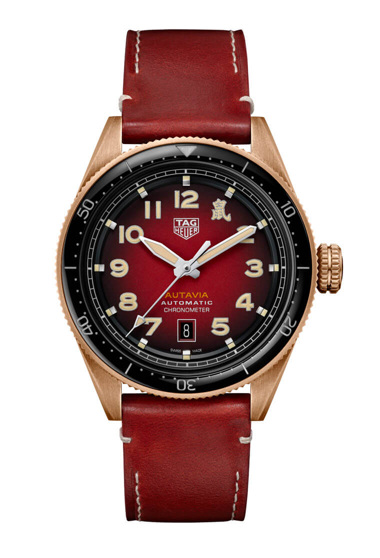 先前不太推出生肖錶的泰格豪雅,這次在Autavia系列鼠年特別版手錶上展現了他們自己的創意,考量到鼠年是十二生肖的排序第一位的生肖,因此品牌特別把Autavia 1點方向的時標改成中文的「鼠」字,即使佩戴者不是華人,但因為十二生肖本來就與大中華文化有關,所以加個中文在手錶面盤上,對於中西方的收藏家都各有珍藏意義。另外提到中國新年最先想到的顏色就是紅色,紅色這種代表節慶與喜氣的顏色,也是中國新年讓人最有記憶點的顏色,因此這款Autavia系列鼠年特別版手錶也應景地用上了漸層紅色面盤(搭配黑色陶瓷錶圈),這個顏色在今年其它市售版的Autavia手錶上都還沒看過,而為了和面盤呼應,所以錶帶也採用紅色小牛皮錶帶,看起來特別有那種喜氣感。
