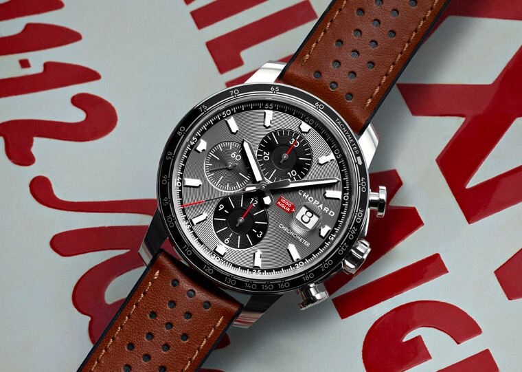 這款錶與2018年的版本有著同中求異的外觀,實際上2019年新款的藍本是蕭邦在2015年首度發表的Mille Miglia GTS腕錶,從錶款的黑色鋁質測速錶圈以及小錶盤呈6、9、12點方向排列的左三眼格局(比起2018年版本的3、6、9點方向小錶盤配置不盡相同),或是表面刻有輪胎紋路的計時按把等,都可以窺見新舊作的傳承關係。當然蕭邦並不只是改改面盤顏色就推出新作,仔細端詳腕錶,可以發現它的外觀線條有所修改,鏡面也在3點方向新加入了凸透鏡,與錶殼形成圓中有圓的意象。2015年的Mille Miglia GTS搭配的是黑色橡膠胎紋錶帶,Mille Miglia 2019 Race Edition則是換成駝色穿孔小牛皮錶帶(錶帶內襯另外使用了帶有1960年代DUNLOP輪胎花紋的橡膠材質),藉以強化腕錶向復古老爺車致敬的熱血風格。