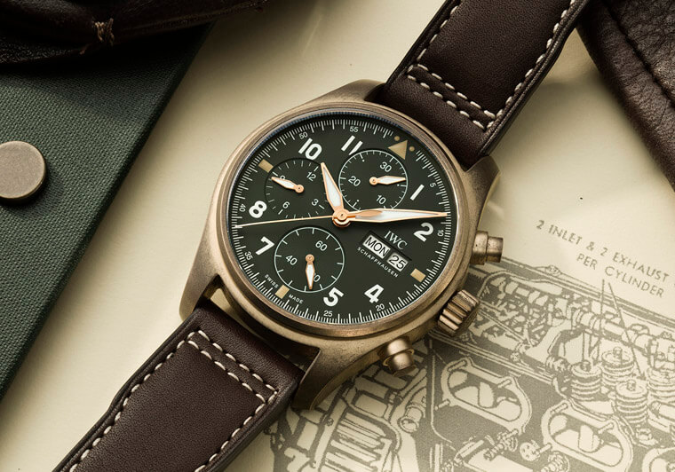 新款IWC噴火戰機系列青銅錶有幾個共同特徵,除了剛出廠的錶殼都帶有一致的青銅溫潤色調,它們還一律採用橄欖綠色面盤並搭配棕色的小牛皮錶帶。而在面盤配置上,這款跟品牌飛行員系列中的其他計時碼錶相去不遠,例如它配置了左三眼錶盤格局,另在3點方向同時設有日期、星期窗,讓佩戴者可以獲得的時間資訊更充足,同時IWC飛行錶招牌的12點方向三角時標也依舊高掛在原地。值得一提的是,噴火戰機飛行員計時碼錶是第一次引進69000系的計時機芯,它具有導柱輪機制、雙向自動上鍊,動力儲存達46小時,機芯和錶殼間還有軟鐵內殼可以保護手錶不受磁場干擾。69000系比起先前飛行員系列長搭載的79000系機芯,外觀上比較明顯的差別在於前者的小秒盤位在6點方向,計時盤位在9點方向,而後者則是小秒盤在9點方向、計時盤在6點方向,其他重點規格沒有太顯著的變化。