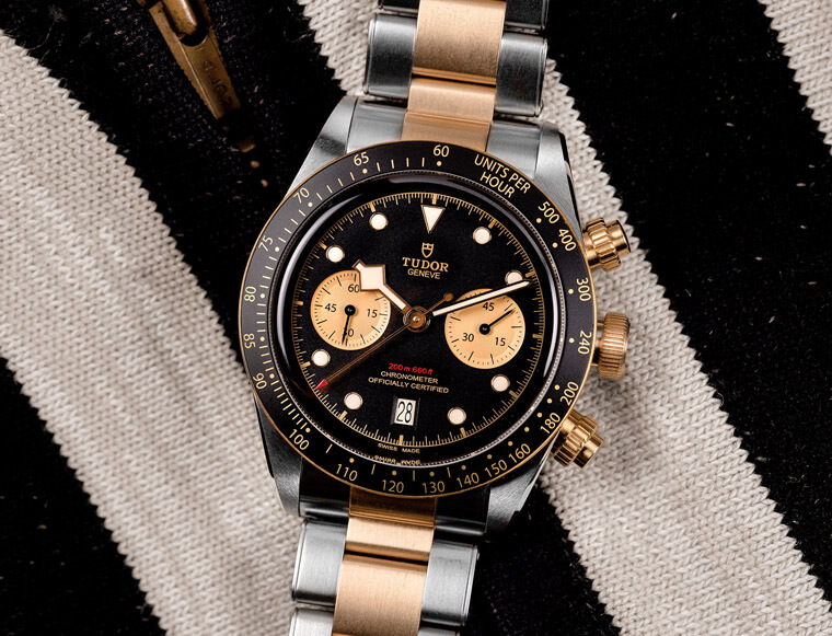 Black Bay Chrono的錶殼在2019年由不鏽鋼升級為不鏽鋼與黃金的半金組合,具體來說是錶殼是鋼做的、錶圈、錶冠和計時按把等則是黃金做的(鍊帶款式的鍊節同樣由雙材質組成)。至於錶圈黑面盤還是黑色系為主,不過為了和半金錶殼呼應,可見帝舵把錶圈刻度、時標、指針、品牌Logo、6點方向的字體甚至是雙眼錶盤一律改成了金色,中央計時秒針的針尖也點上一抹紅色,使得錶款看起來更有復古懷舊感,加上黃金與生俱來的貴氣,賦予這款Black Bay Chrono S&G呈現出與先前不鏽鋼款式不盡相同的個性。它搭載的機芯MT5813正是帝舵與百年靈互換機芯激盪出的火花,但是帝舵還是有調整機芯的細節,例如規格方面多了矽游絲與可變性慣性擺輪,不但有效提升了機芯的耐用度與抗磁性,更強化了機芯本身的精準度。