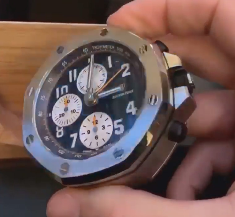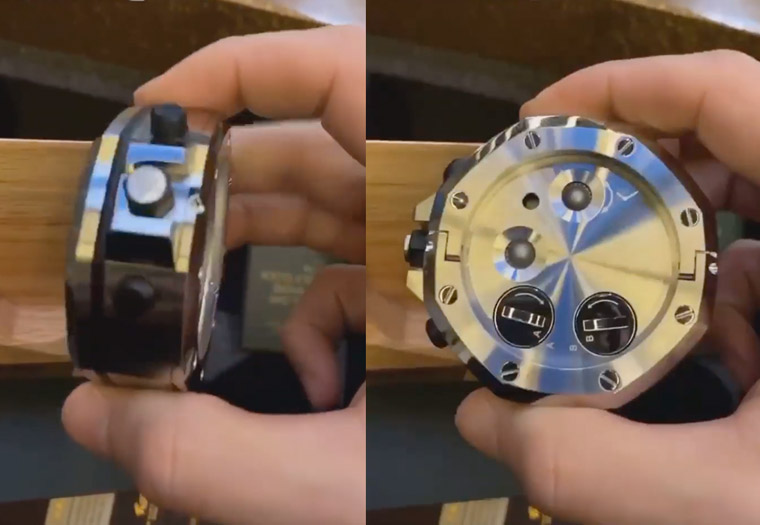 雖然說是座鐘,但是John Mayer收到的這款,它的錶頭就是直接做成皇家橡樹離岸型計時碼錶的樣子,不過照John Mayer拿在手上的樣子,估計這座鐘錶頭的直徑少說也有個50、60mm跑不掉,而且側面看起來也滿厚實的,如果是手錶戴在手上應該會有點沉甸甸的感覺,當John Mayer翻到錶背時也看到了錶款背面並非透明底蓋露出機械結構,而是在下方有兩枚看起來是調校時間用的轉盤,推測這款座鐘可能是石英機芯,而錶背也有個活動式支架,這可以讓座鐘的錶頭獨立放置在任何地方。