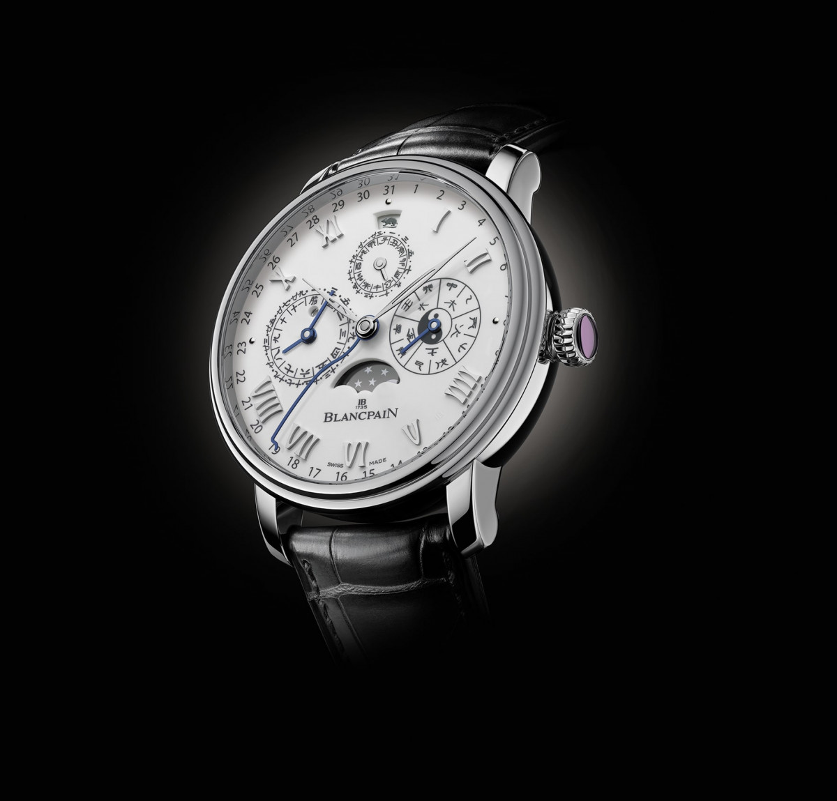 2020為中國錦鼠年,此次的生肖主角錦鼠出現於12點鐘的窗口,其下是以數字和中文顯示的小時及時辰指示盤。10個天干與五行顯示在3點鐘位置,而9點鐘位置小面盤通過兩支指針顯示月份和日期,並設有專門的孔徑指示閏月。月相作為中國農曆的靈魂,亦是寶珀最引以為傲的特點之一,則出現於6點鐘位置。我們日常使用的時分主針當然不可缺少,藍鋼蛇形指針則指示出圍繞面盤邊緣的公曆日期。