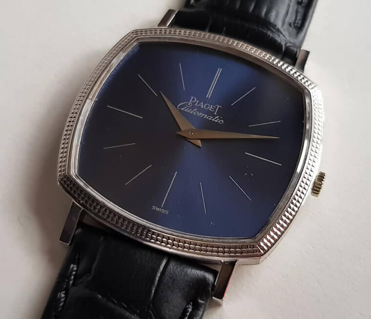 ▲圖為伯爵藍面盤超薄錶,18K白金材質。當年沒有防水設計,因此大部份面盤都是重新翻寫或已損壞。這只還能保有良好品相與原創面盤實屬少見。