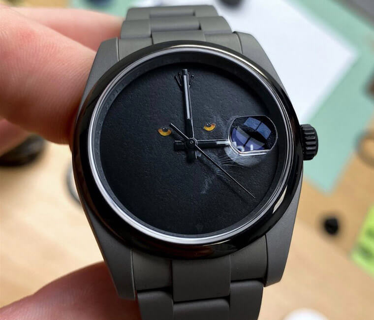 據MAD Paris表示,面盤的彩繪圖案並非機器印刷,而是請了高手操刀——法國新生代畫家Isabelle Villa,她自從2007年從藝術相關科系畢業後就開始從事微型畫的工作,她曾幫芝柏表、愛馬仕、JACOB & Co等品牌的手錶進行微繪創作,在鐘錶業界的名氣逐漸累積中,瞧她在Datejust面盤上也不過就大約30mm出頭的空間竟然能以手工畫出一隻眼神超犀利的黑豹,可見畫工確實有兩把刷子,而經過畫家巧手一畫上圖案後,整只Datejust改錶就脫離了只是黑黑的、很潮的狀態,還另外多出一些藝術氣息,相信錶主應該是對自己的錶滿有想法的,他不只想要改錶,還想要改出一個專屬自己的態度,只是如此一來荷包也要夠深才行。