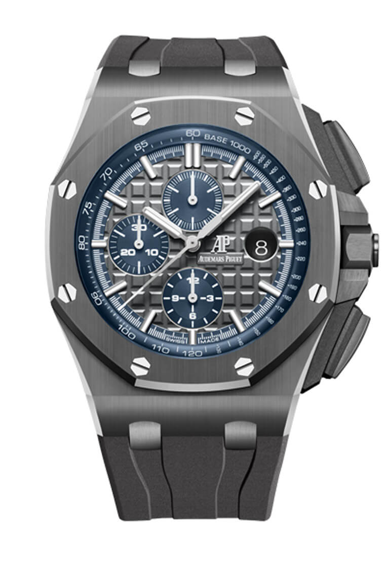 而為了呼應錶殼的灰色,錶款的錶帶以及面盤也採用了同色系,面盤方面由於愛彼近年無論是皇家橡樹或是離岸型都較常推出面盤與計時小錶盤不同色的雙色錶殼,所以這款的小錶盤以及面盤外緣測速計的部分則是搭配了深藍色,這樣一來錶款的視覺對比感也比較鮮明,如果整個面盤都是灰色系,可能閱讀時間起來會比較吃力些。而在面盤上同樣會見到ROO系列招牌的Méga Tapisserie格紋裝飾,這種愛彼特色的裝飾工藝也是手錶建立辨識度的關鍵因素。