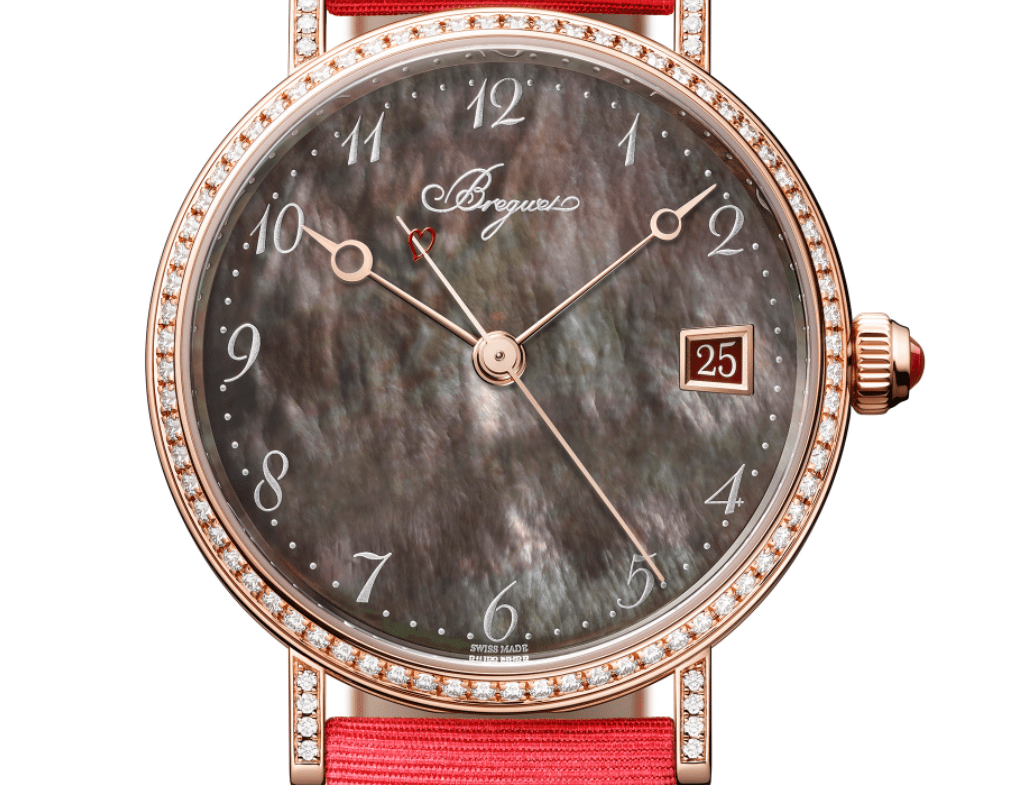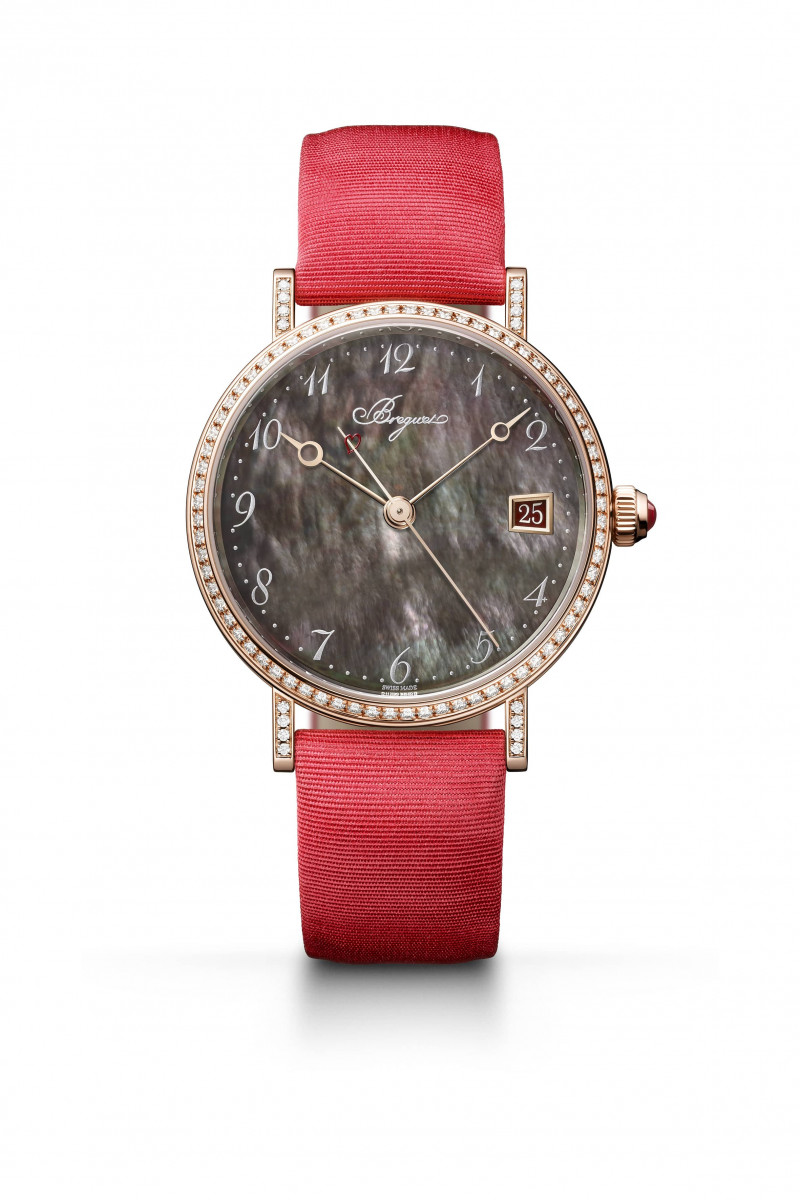 全新Classique 9065經典系列首次呈獻絕美光澤的大溪地珍珠母貝面盤,朱砂紅色以溫情暖意妝點時計,與錶冠處嵌飾天然紅寶石的瑰麗紅色相互輝映。秒針的金質色調映襯精美的深紅色心形裝飾。顯示日期的乳白色數字,呈現於石榴紅視窗之上,閃耀紅色緞面錶帶則令時計更添奪目閃耀。88顆明亮式切割鑽石,於精巧的玫瑰金錶圈及錶耳之上熠熠生輝,倍顯流光溢彩。