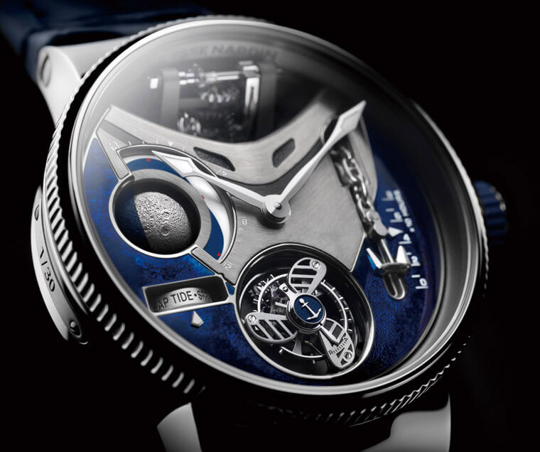 ▲實際模擬了月面凹凸的球體月相半邊鍍銠、半邊是藍色PVD,下方連動的轉盤用以表示望月的大潮(SPRING TIDE)和朔月的小潮(NEAP TIDE),外圍的潮汐狀態則可依據錶主指定的地點進行訂製。